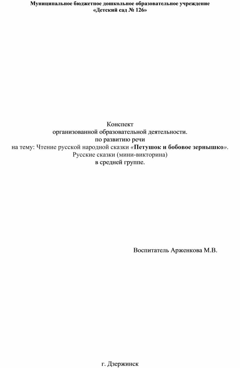 на тему: Чтение русской народной сказки «Петушок и бобовое зернышко».