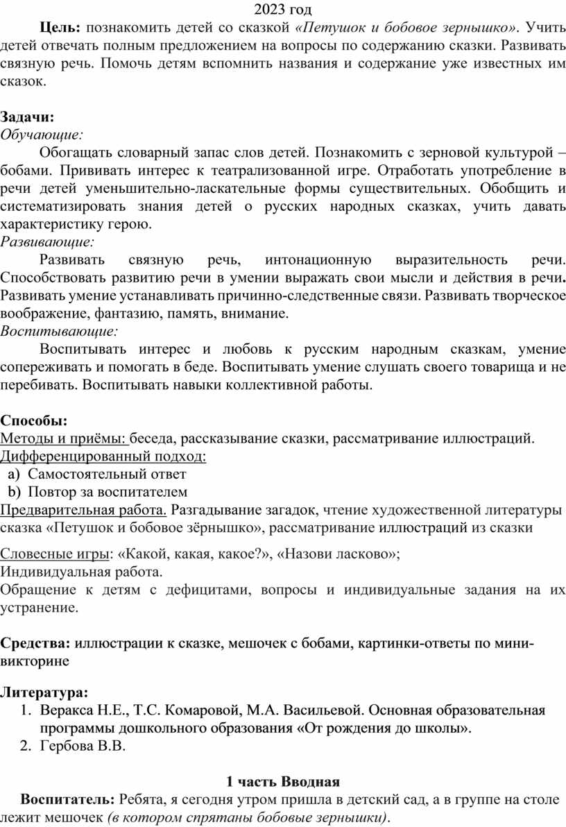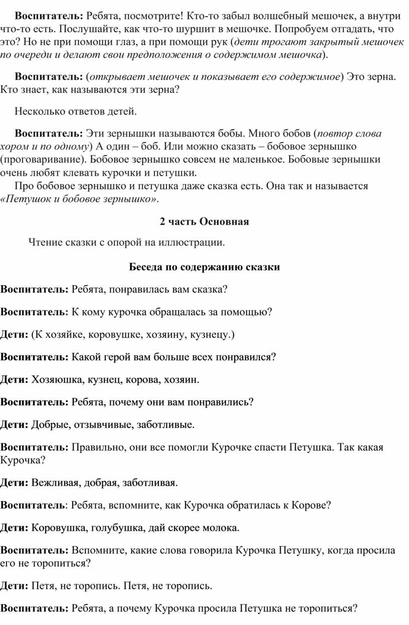 Цель: познакомить детей со сказкой «Петушок и бобовое зернышко». Учить детей отвечать полным предложением на вопросы по содержанию сказки. Развивать связную речь. Помочь детям вспомнить названия и содержание уже известных им сказок.