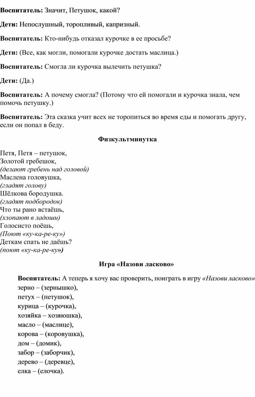 Воспитатель: Вспомните, какие слова говорила Курочка Петушку, когда просила его не торопиться?