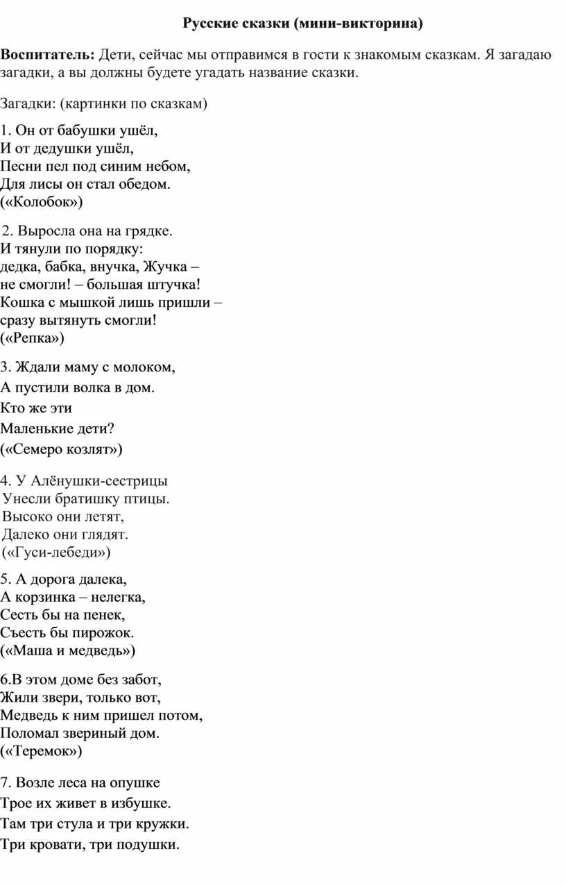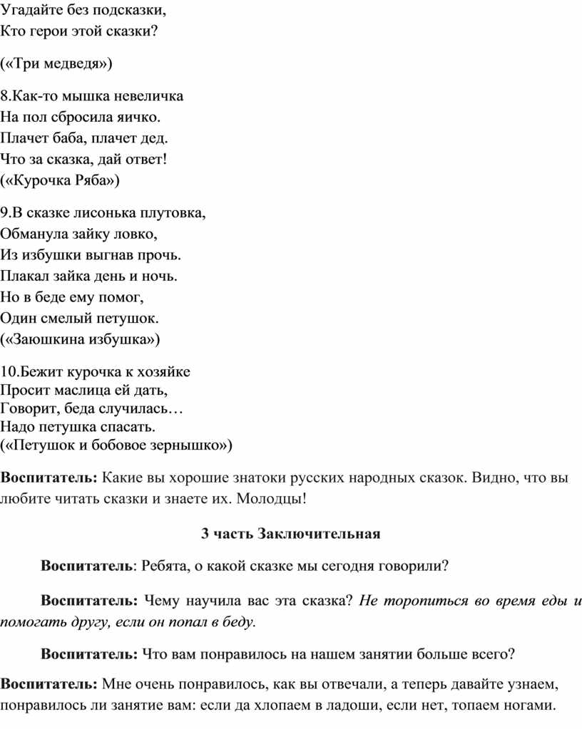 Воспитатель: Какие вы хорошие знатоки русских народных сказок. Видно, что вы любите читать сказки и знаете их. Молодцы!