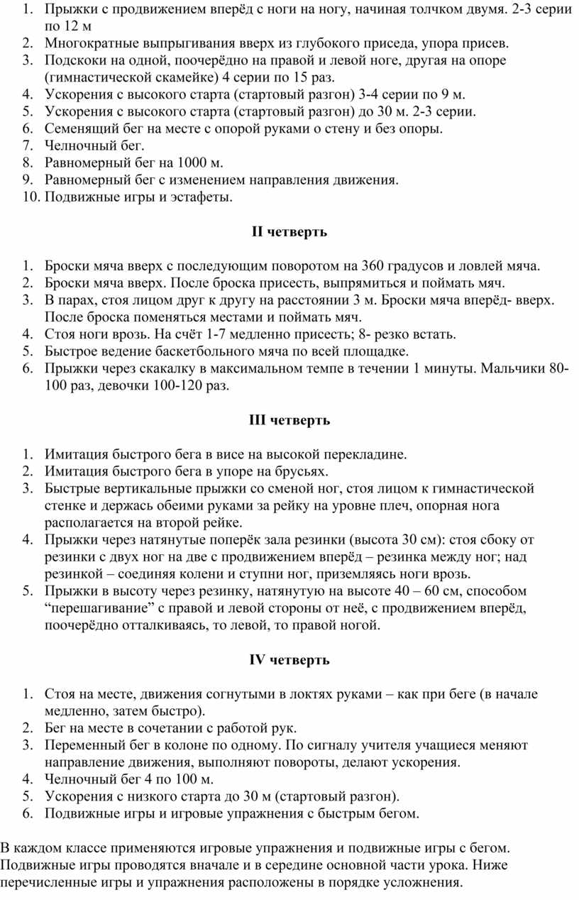 В I четверти на уроках лёгкой атлетики нацелено работаю над развитием скоростно-силовых качеств и быстроты. Специальные упражнения даю в начале основной части урока. Над развитием этих качеств работаю во II и III четвертях, когда изучаются учебные темы разделов “Спортивные игры” и “Гимнастики”. На уроках лёгкой атлетики IV четверти идёт подготовка к сдаче нормативов в беге. Главная задача при этом: развитие скоростно-силовых качеств и быстроты. Дозирование нагрузки, число повторений каждого применяемого упражнения определяется с учётом уровня физической подготовленности учащихся. Используются подвижные игры и игровые упражнения, включающие в себя быстрый бег. Основой для развития скоростных качеств составляют разработанные комплексы упражнений для определённого возраста.