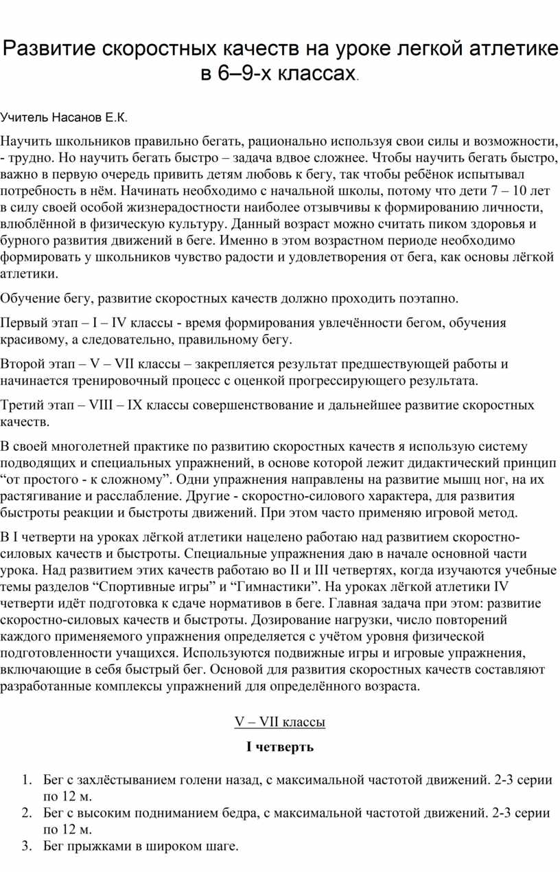 Развитие скоростных качеств на уроке легкой атлетике в 6–9-х классах.