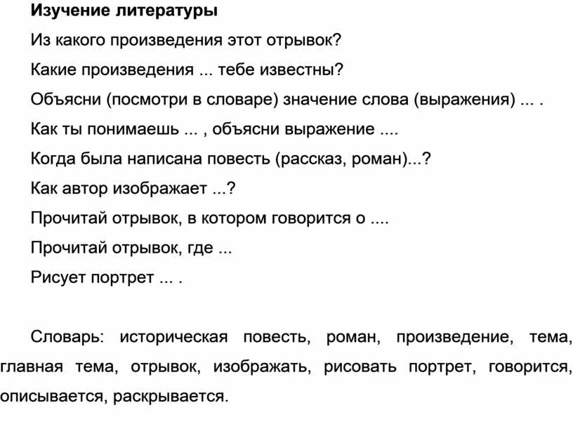 Словарь: историческая повесть, роман, произведение, тема, главная тема, отрывок, изображать, рисовать портрет, говорится, описывается, раскрывается.