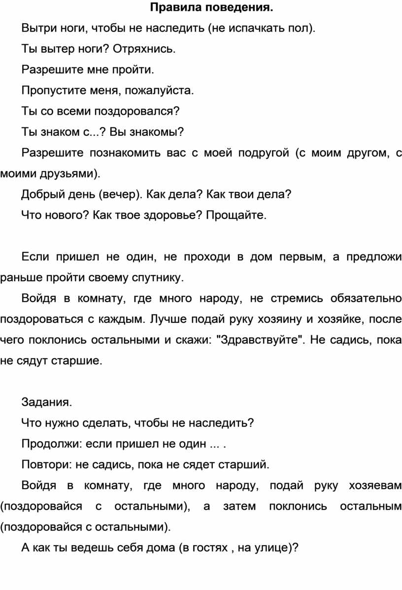 Войдя в комнату, где много народу, не стремись обязательно поздороваться с каждым. Лучше подай руку хозяину и хозяйке, после чего поклонись остальными и скажи: "Здравствуйте". Не садись, пока не сядут старшие.