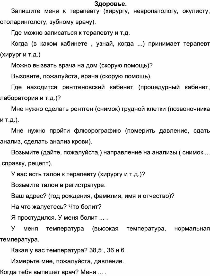 Запишите меня к терапевту (хирургу, невропатологу, окулисту, отоларингологу, зубному врачу).