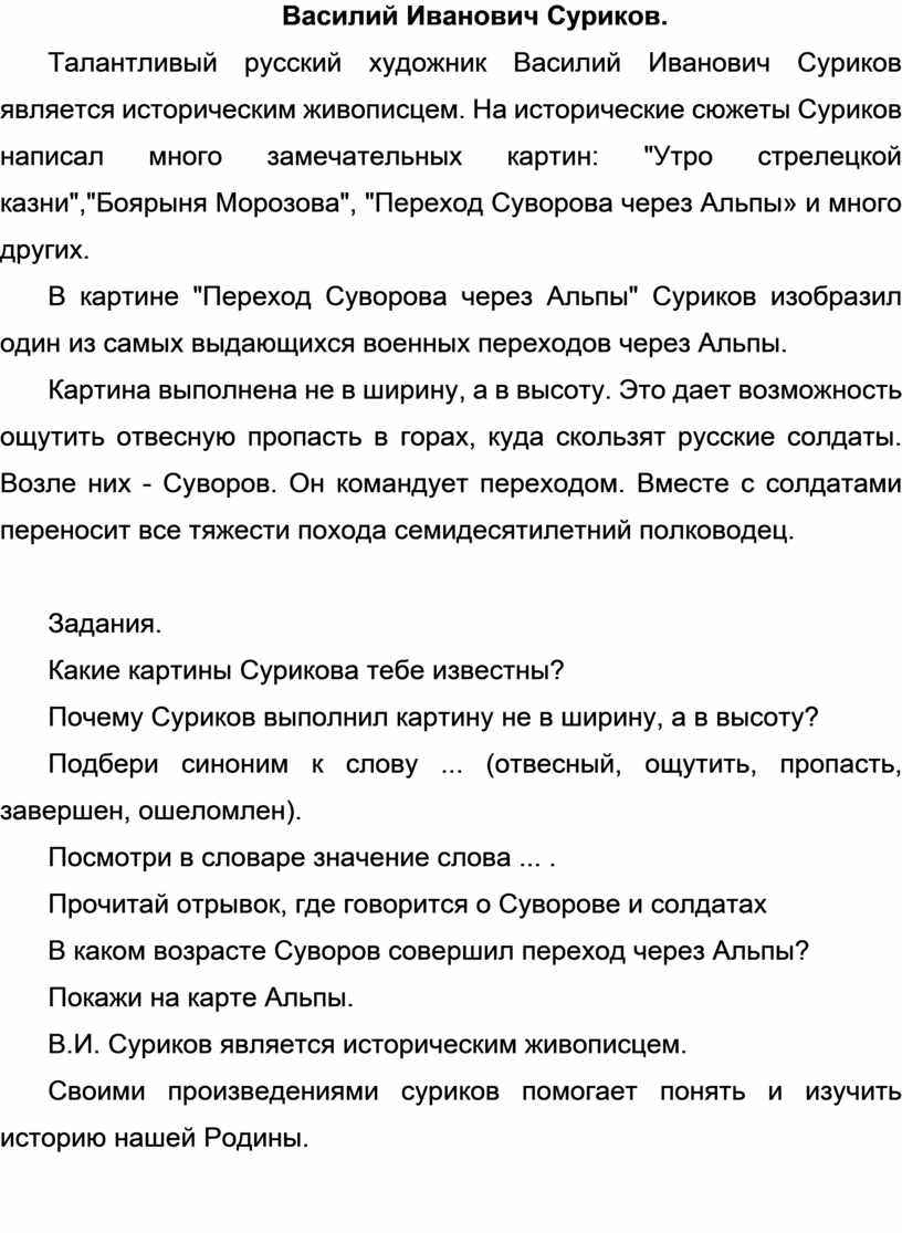 Талантливый русский художник Василий Иванович Суриков является историческим живописцем. На исторические сюжеты Суриков написал много замечательных картин: "Утро стрелецкой казни","Боярыня Морозова", "Переход Суворова через Альпы» и много других.