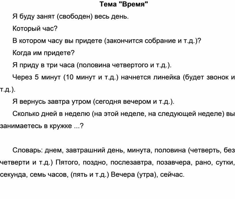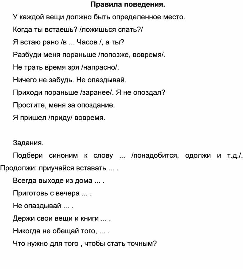 Словарь: назначенное время, нужно - необходимо, порядок -распорядок, вставать, тратить, искать, спешить, опаздывать, приходить вовремя, обещать, выполнять, заранее, рано, пораньше, поздно, позднее.