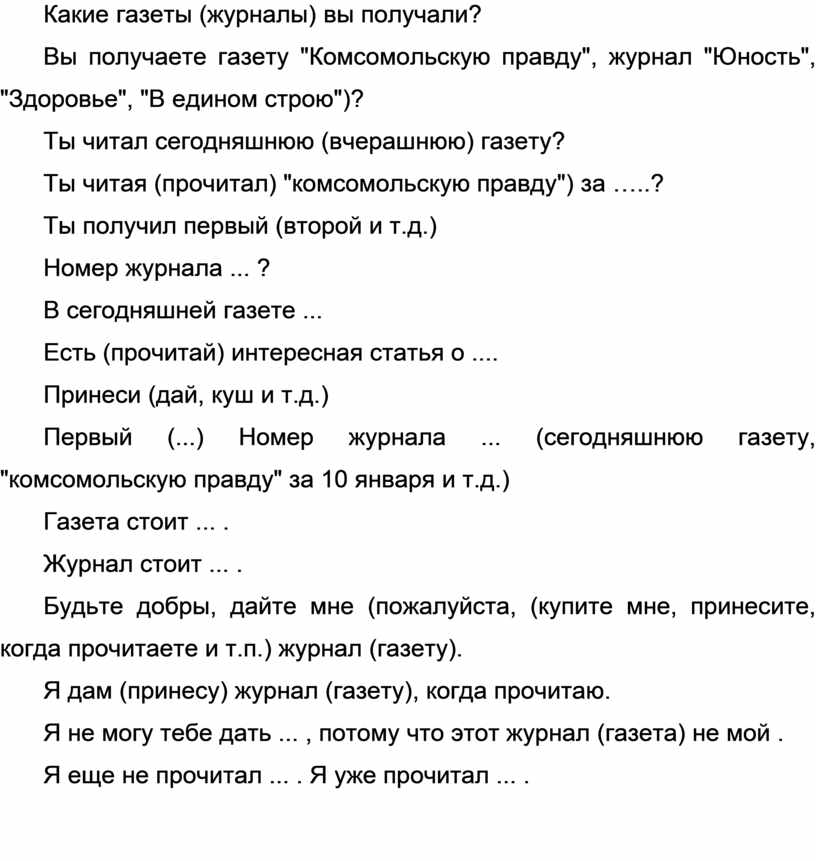 Словарь: газета, журнал, названия газет и журналов, статья, заметка, рассказ, прогноз погода, программа телевидения, сегодняшняя (вчерашняя) газета, получить, читать, покупать, читать -прочитать ~ перечитать, дать - передать, купить – покупать.