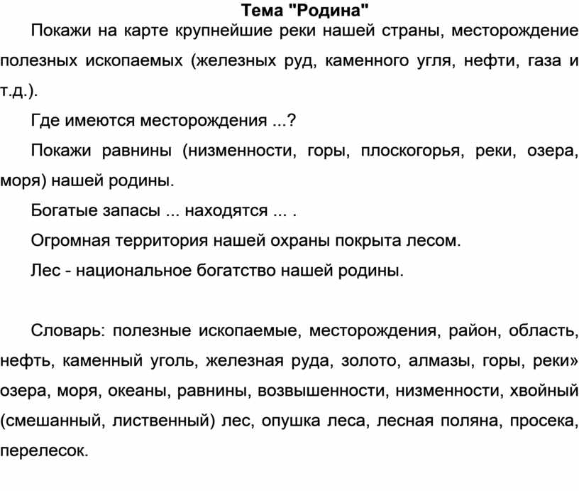 Словарь: полезные ископаемые, месторождения, район, область, нефть, каменный уголь, железная руда, золото, алмазы, горы, реки» озера, моря, океаны, равнины, возвышенности, низменности, хвойный (смешанный, лиственный) лес, опушка леса, лесная поляна, просека, перелесок.