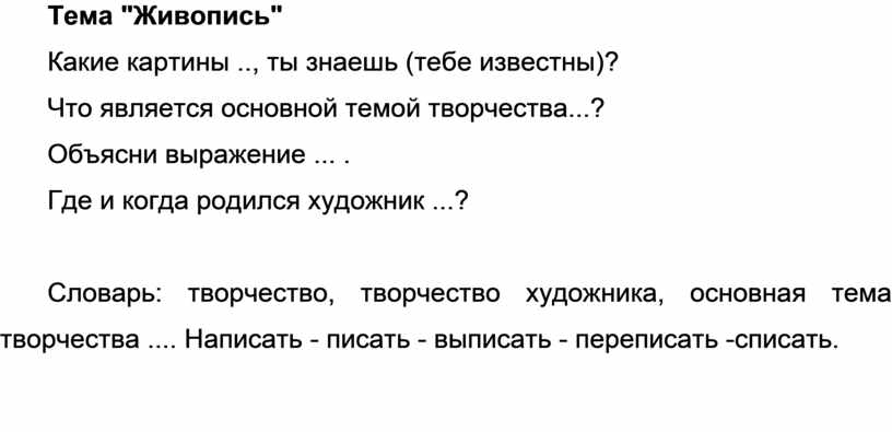 Словарь: художник, картина, произведения, репродукция, реалистическое произведение, написать, нарисовать, изобразить, высказать, проиллюстрировать, выразить.
