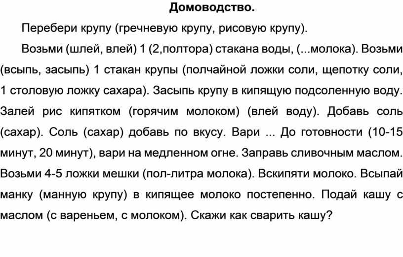 Возьми (шлей, влей) 1 (2,полтора) стакана воды, (...молока). Возьми (всыпь, засыпь) 1 стакан крупы (полчайной ложки соли, щепотку соли, 1 столовую ложку сахара). Засыпь крупу в кипящую подсоленную воду. Залей рис кипятком (горячим молоком) (влей воду). Добавь соль (сахар). Соль (сахар) добавь по вкусу. Вари ... До готовности (10-15 минут, 20 минут), вари на медленном огне. Заправь сливочным маслом. Возьми 4-5 ложки мешки (пол-литра молока). Вскипяти молоко. Всыпай манку (манную крупу) в кипящее молоко постепенно. Подай кашу с маслом (с вареньем, с молоком). Скажи как сварить кашу?