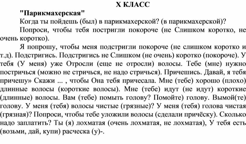 Я попрошу, чтобы меня подстригли покороче (не слишком коротко и т.д). Подстригись. Подстригись не Слишком (не очень) коротко (покороче). У тебя (У меня) уже Отросли (еще не отросли) волосы. Тебе (мне) нужно постричься (можно не стричься, не надо стричься). Причешись. Давай, я тебя причешу» Скажи ... , чтобы Она тебя причесала. Мне (тебе) хорошо (плохо) длинные волосы (короткие волосы). Мне (тебе) идут (не идут) короткие (длинные) волосы. Вам (тебе) помыть голову? Помойте) голову. Вымой(те) голову. У меня (тебя) волосы чистые (грязные)? У меня (тебя) голова чистая (грязная)? Попроси, чтобы тебе уложили волосы (сделали причёску). Сколько надо заплатить? Ты (я) лохматая (очень лохматая, не лохматая), У тебя есть (возьми, дай, купи) расческа (у)-.