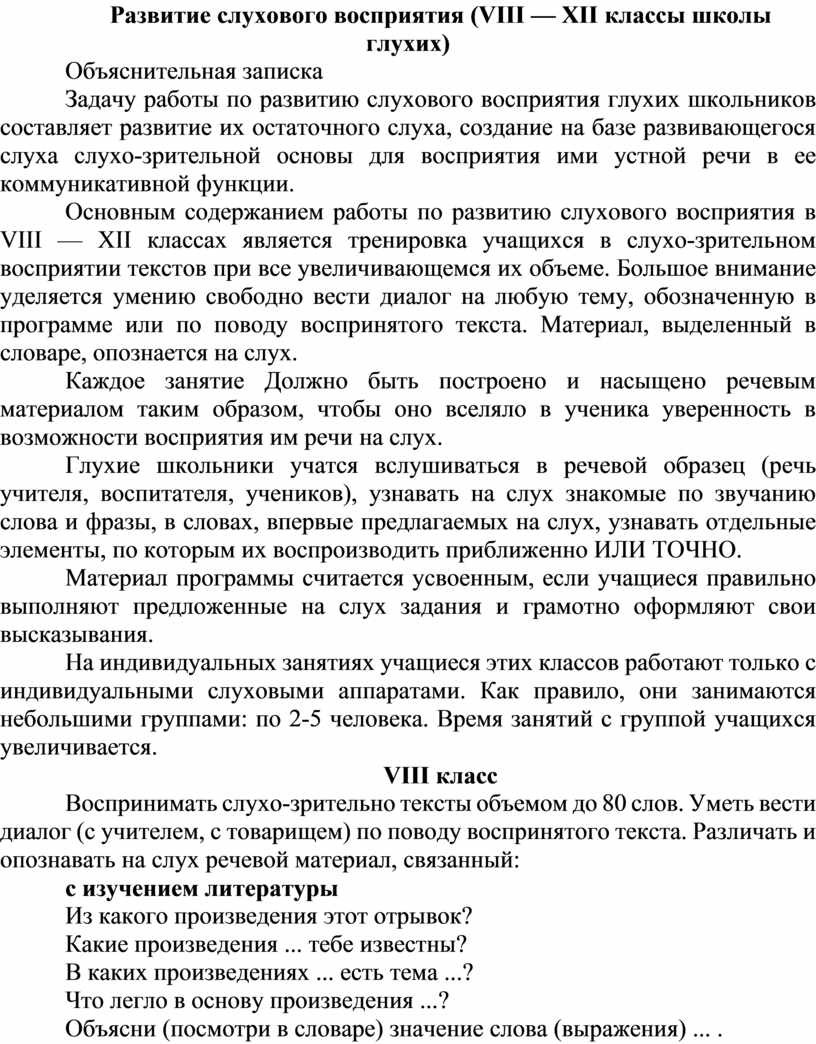Развитие слухового восприятия (VIII — XII классы школы глухих)