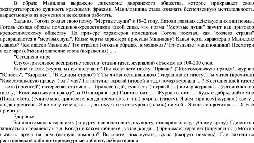 Задания. Гоголь создал свою поэму "Мертвые души" в 1842 году. Назови главных действующих лиц поэмы. Гоголь создал образы помещиков-крепостников такой силы, что поэма "Мертвые души" звучит как приговор крепостническому обществу. На примере характеров помещиков Гоголь показал, как "хозяева страны" превращаются в "мертвых душ". Какие черты характера присущи Манилову? Какая черта характера в Манилове главная? Чем опасен Манилов? Что отразил Гоголь в образах помещиков? Что означает маниловщина? Посмотри в словаре (объясни) значение слова (выражения) ... .