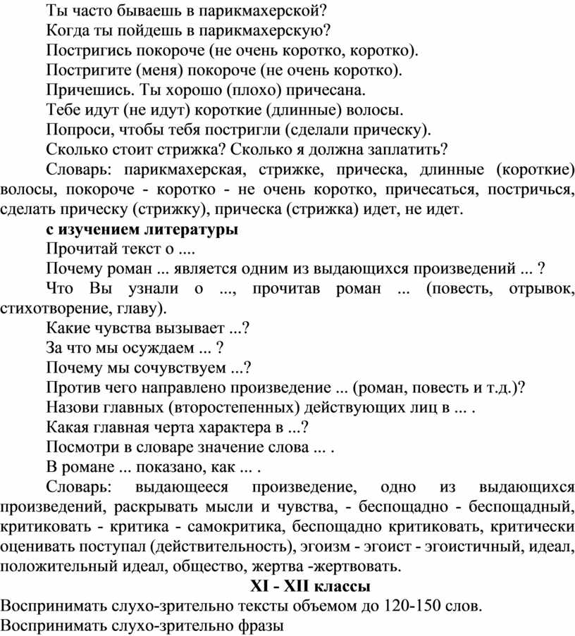 Воспринимать слухо-зрительно тексты объемом до 100 слов. Уметь вести диалог (с учителем, с товарищем) по поводу воспринятого текста. Различать и опознавать на слух речевой материал, связанный: