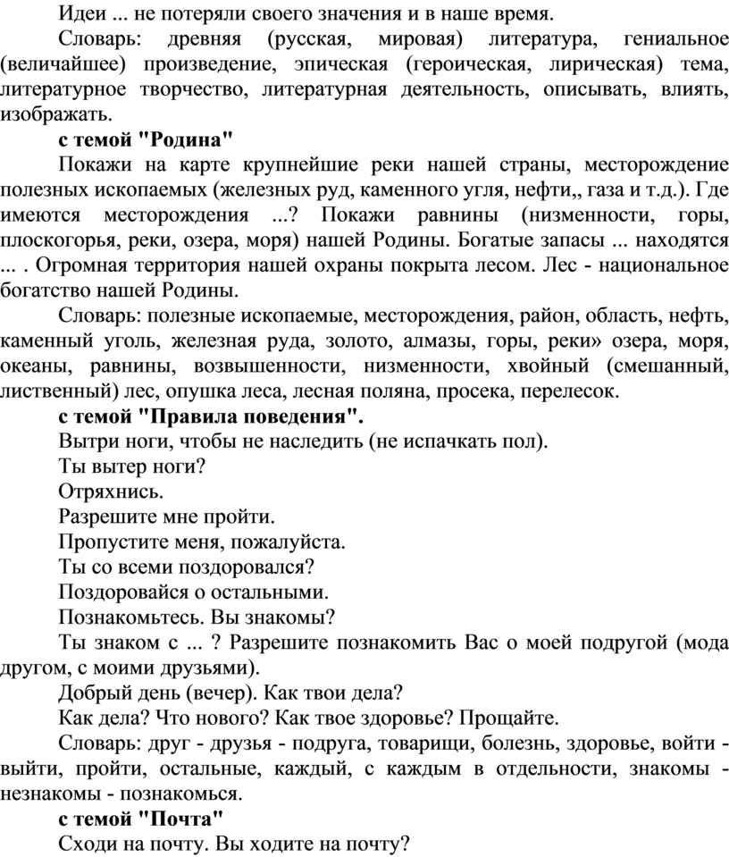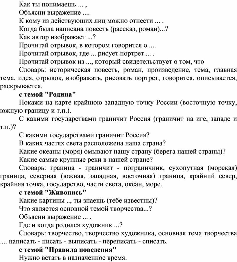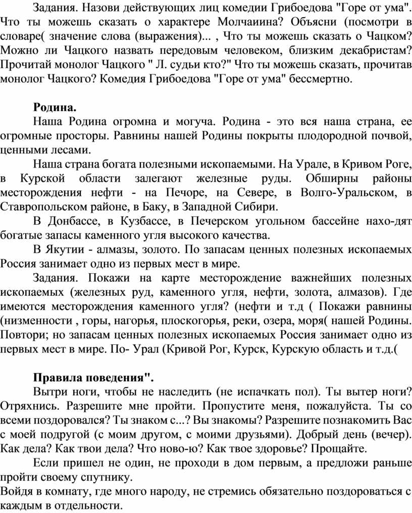 Покажи на карте крупнейшие реки нашей страны, месторождение полезных ископаемых (железных руд, каменного угля, нефти,, газа и т.д.). Где имеются месторождения ...? Покажи равнины (низменности, горы, плоскогорья, реки, озера, моря) нашей Родины. Богатые запасы ... находятся ... . Огромная территория нашей охраны покрыта лесом. Лес - национальное богатство нашей Родины.
