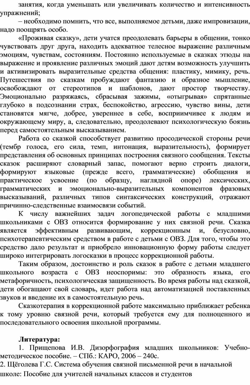 К числу важнейших задач логопедической работы с младшими школьниками с ОВЗ относится формирование у них связной речи. Сказка является эффективным развивающим, коррекционным и, безусловно, психотерапевтическим средством в работе с детьми с ОВЗ. Для того, чтобы это средство дало результат и приобрело инновационную форму работы следует широко интегрировать логосказки в процесс коррекционной работы.