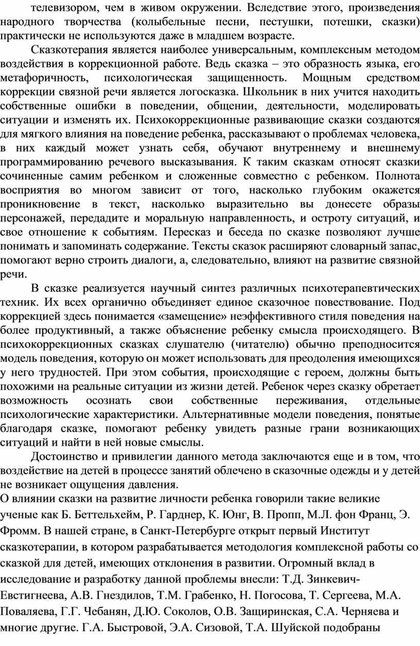 Одним из древнейших методов, активно разрабатываемых логопедами, психологами и педагогами в последние 10 лет и применяемых в работе с детьми с ОВЗ, является использование сказкотерапии. В энциклопедическом литературном словаре дается следующее определение сказки: «сказка – это один из основных жанров устного народно-поэтического творчества, эпическое, преимущественно прозаическое художественное произведение волшебного, авантюрного или бытового характера с установкой на вымысел. Сказкой также называют различные виды устной прозы» (5, c.383).