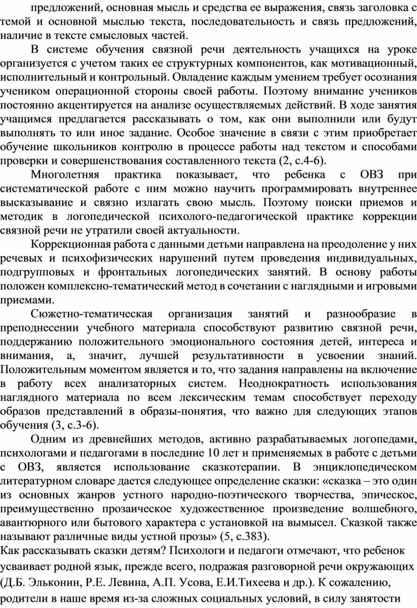 Многолетняя практика показывает, что ребенка с ОВЗ при систематической работе с ним можно научить программировать внутреннее высказывание и связно излагать свою мысль. Поэтому поиски приемов и методик в логопедической психолого-педагогической практике коррекции связной речи не утратили своей актуальности.