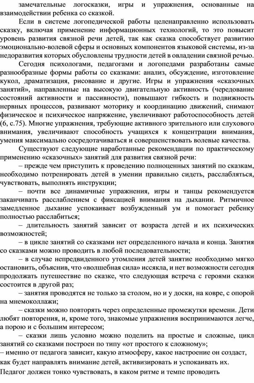 Если в системе логопедической работы целенаправленно использовать сказку, включая применение информационных технологий, то это повысит уровень развития связной речи детей, так как сказка способствует развитию эмоционально-волевой сферы и основных компонентов языковой системы, из-за недоразвития которых обусловлены трудности детей в овладении связной речью.