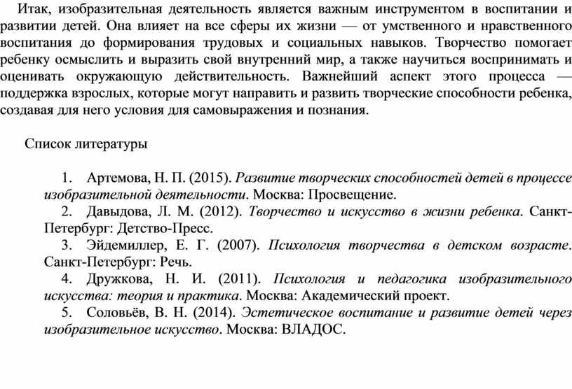 1. Артемова, Н. П. (2015). Развитие творческих способностей детей в процессе изобразительной деятельности. Москва: Просвещение.