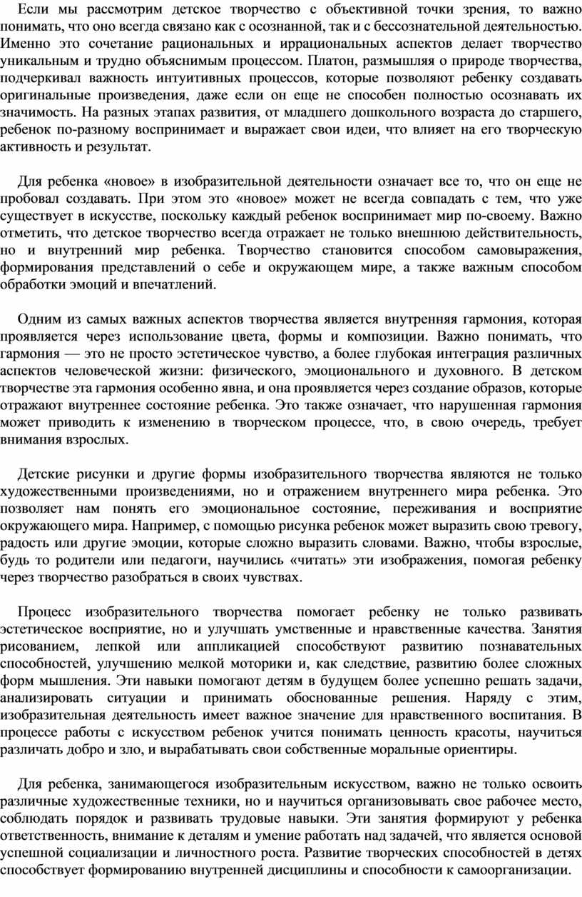 Если мы рассмотрим детское творчество с объективной точки зрения, то важно понимать, что оно всегда связано как с осознанной, так и с бессознательной деятельностью. Именно это сочетание рациональных и иррациональных аспектов делает творчество уникальным и трудно объяснимым процессом. Платон, размышляя о природе творчества, подчеркивал важность интуитивных процессов, которые позволяют ребенку создавать оригинальные произведения, даже если он еще не способен полностью осознавать их значимость. На разных этапах развития, от младшего дошкольного возраста до старшего, ребенок по-разному воспринимает и выражает свои идеи, что влияет на его творческую активность и результат.