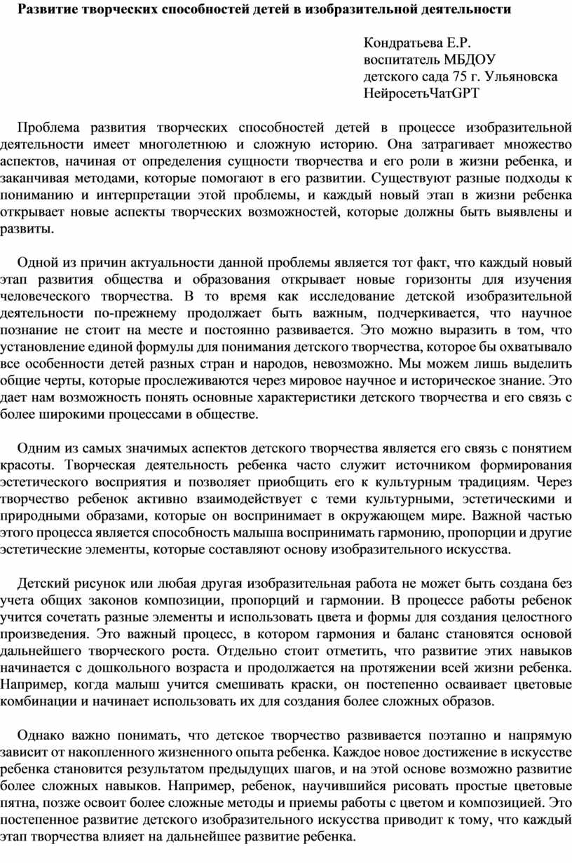 Проблема развития творческих способностей детей в процессе изобразительной деятельности имеет многолетнюю и сложную историю. Она затрагивает множество аспектов, начиная от определения сущности творчества и его роли в жизни ребенка, и заканчивая методами, которые помогают в его развитии. Существуют разные подходы к пониманию и интерпретации этой проблемы, и каждый новый этап в жизни ребенка открывает новые аспекты творческих возможностей, которые должны быть выявлены и развиты.
