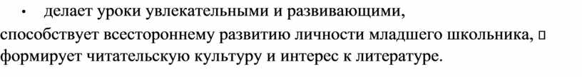 • способствует всестороннему развитию личности младшего школьника, формирует читательскую культуру и интерес к литературе.