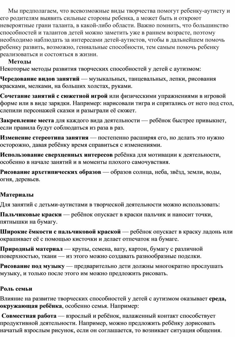 Влияние на развитие творческих способностей у детей с аутизмом оказывает среда, окружающая ребёнка, особенно семья. Например: