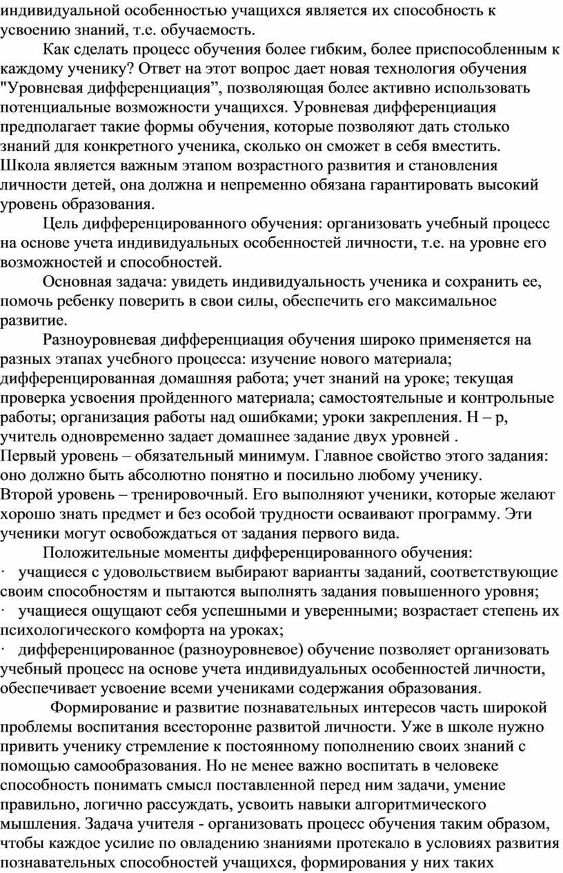 Как сделать процесс обучения более гибким, более приспособленным к каждому ученику? Ответ на этот вопрос дает новая технология обучения "Уровневая дифференциация”, позволяющая более активно использовать потенциальные возможности учащихся. Уровневая дифференциация предполагает такие формы обучения, которые позволяют дать столько знаний для конкретного ученика, сколько он сможет в себя вместить.