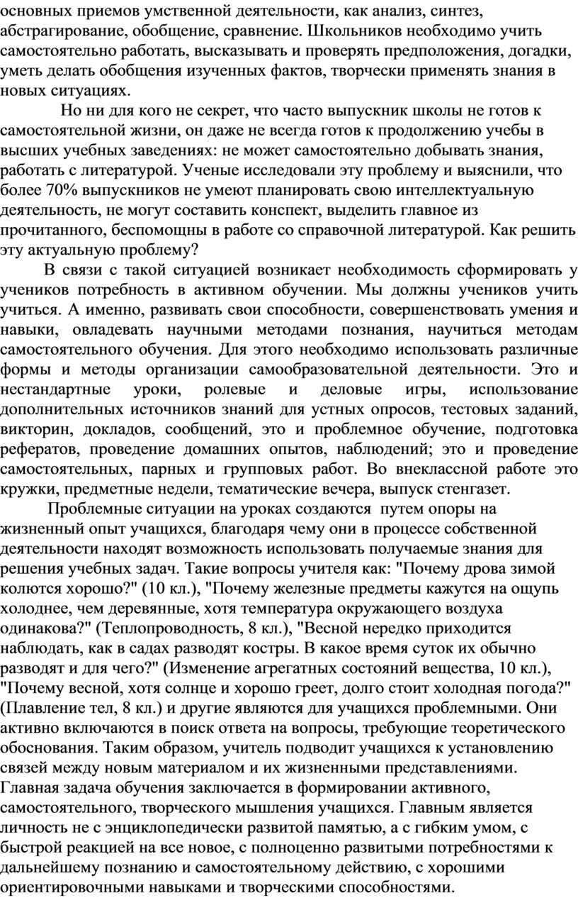 Но ни для кого не секрет, что часто выпускник школы не готов к самостоятельной жизни, он даже не всегда готов к продолжению учебы в высших учебных заведениях: не может самостоятельно добывать знания, работать с литературой. Ученые исследовали эту проблему и выяснили, что более 70% выпускников не умеют планировать свою интеллектуальную деятельность, не могут составить конспект, выделить главное из прочитанного, беспомощны в работе со справочной литературой. Как решить эту актуальную проблему?