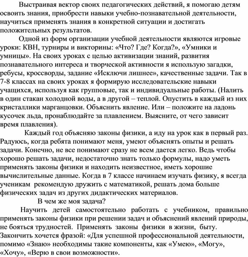 Выстраивая вектор своих педагогических действий, я помогаю детям освоить знания, приобрести навыки учебно-познавательной деятельности, научиться применять знания в конкретной ситуации и достигать положительных результатов.