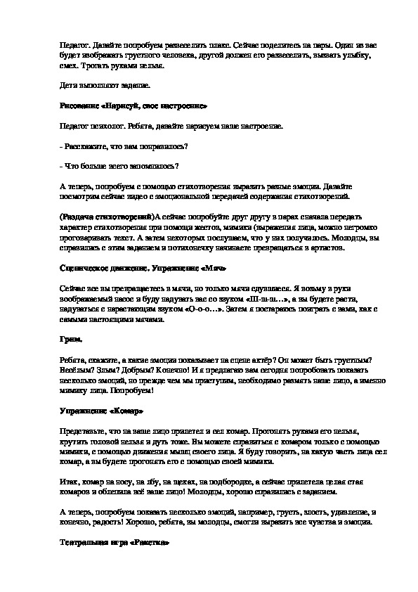 Педагог. Давайте попробуем развеселить плакс. Сейчас поделитесь на пары. Один из вас будет изображать грустного человека, другой должен его развеселить, вызвать улыбку, смех. Трогать руками нельзя.