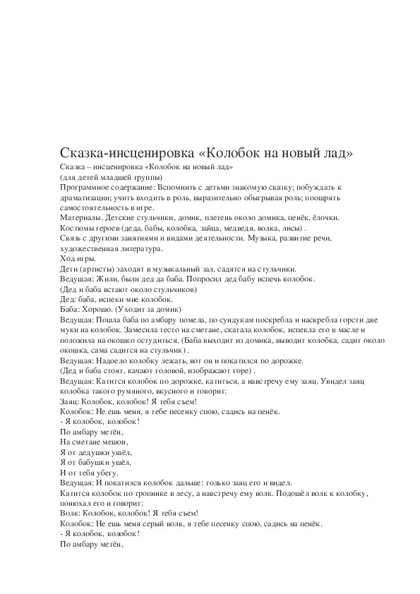 обратить внимание детей на то, что в движении участвуют все части тела.Сказкаинсценировка «Колобок на новый лад»