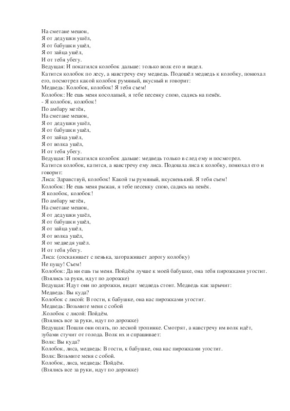 Ведущая: Вот такая наша сказка. И колобок остался цел и звери сыты. Тут и сказке конец,