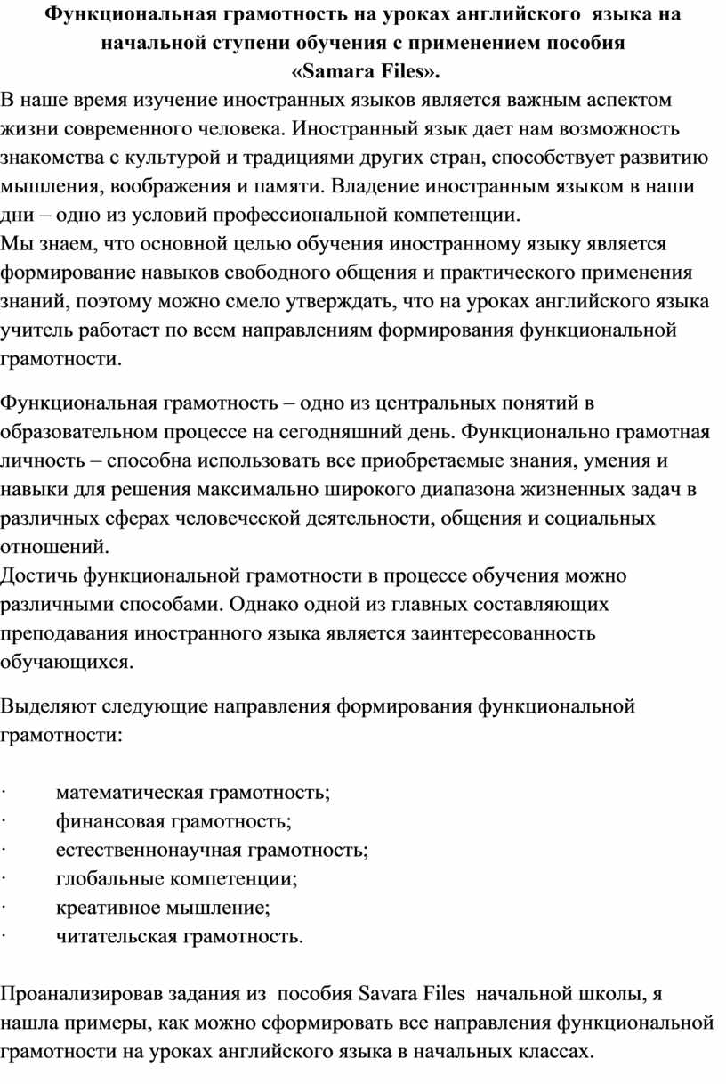 Функциональная грамотность на уроках английского языка на начальной ступени обучения с применением пособия