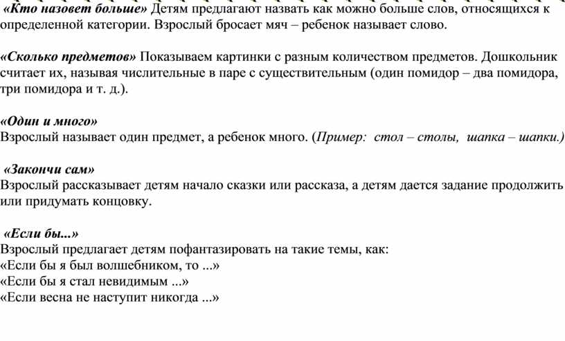 «Кто назовет больше» Детям предлагают назвать как можно больше слов, относящихся к определенной категории. Взрослый бросает мяч – ребенок называет слово.