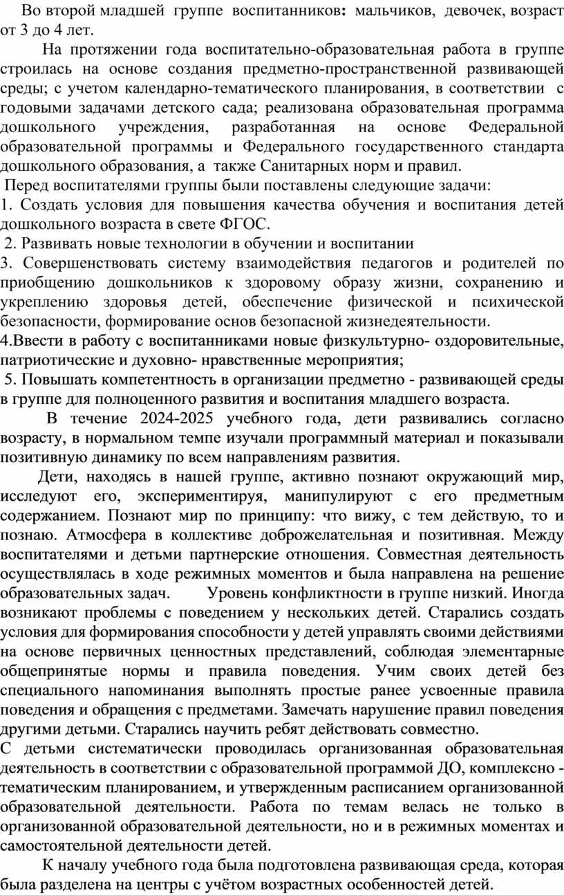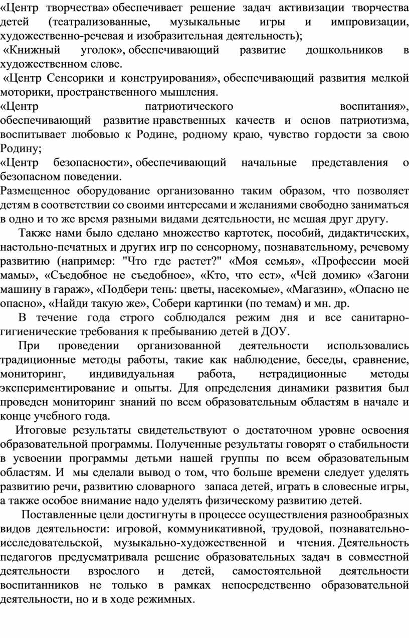 На протяжении года воспитательно-образовательная работа в группе строилась на основе создания предметно-пространственной развивающей среды; с учетом календарно-тематического планирования, в соответствии с годовыми задачами детского сада; реализована образовательная программа дошкольного учреждения, разработанная на основе Федеральной образовательной программы и Федерального государственного стандарта дошкольного образования, а также Санитарных норм и правил.