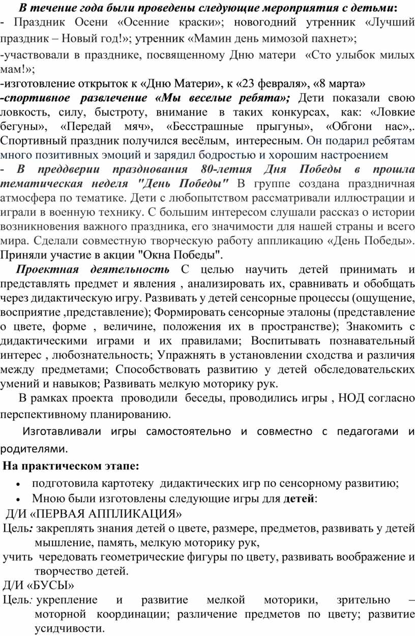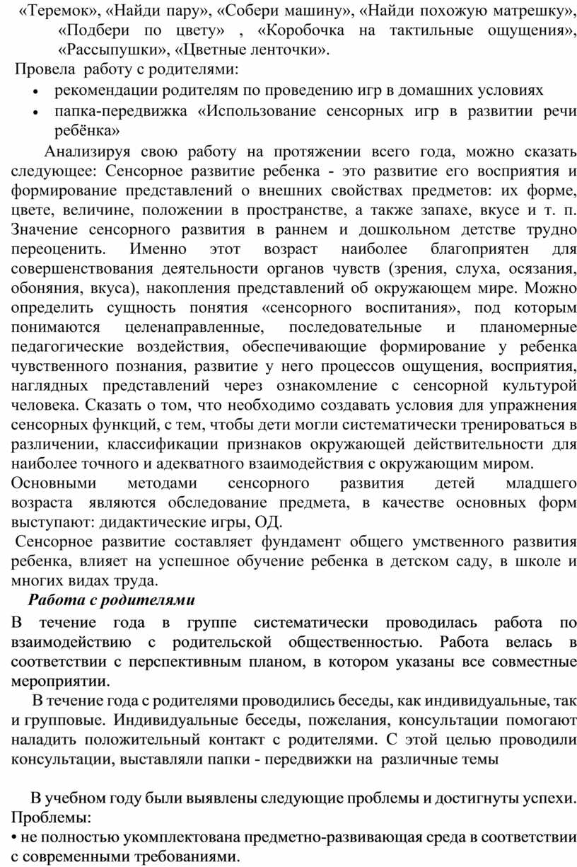 Анализируя свою работу на протяжении всего года, можно сказать следующее: Сенсорное развитие ребенка - это развитие его восприятия и формирование представлений о внешних свойствах предметов: их форме, цвете, величине, положении в пространстве, а также запахе, вкусе и т. п. Значение сенсорного развития в раннем и дошкольном детстве трудно переоценить. Именно этот возраст наиболее благоприятен для совершенствования деятельности органов чувств (зрения, слуха, осязания, обоняния, вкуса), накопления представлений об окружающем мире. Можно определить сущность понятия «сенсорного воспитания», под которым понимаются целенаправленные, последовательные и планомерные педагогические воздействия, обеспечивающие формирование у ребенка чувственного познания, развитие у него процессов ощущения, восприятия, наглядных представлений через ознакомление с сенсорной культурой человека. Сказать о том, что необходимо создавать условия для упражнения сенсорных функций, с тем, чтобы дети могли систематически тренироваться в различении, классификации признаков окружающей действительности для наиболее точного и адекватного взаимодействия с окружающим миром.