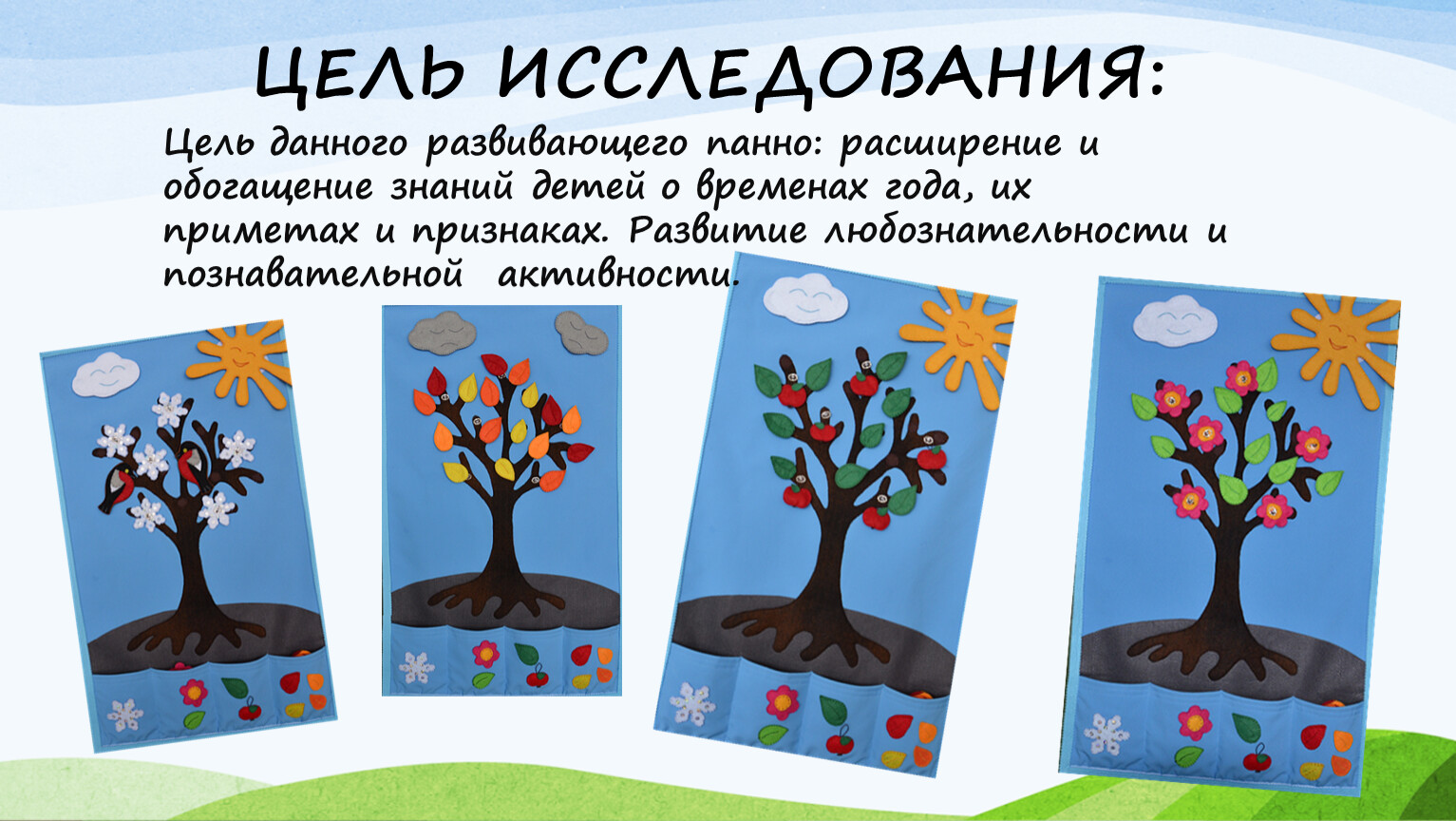Цель данного развивающего панно: расширение и обогащение знаний детей о временах года, их приметах и признаках. Развитие любознательности и познавательной активности.