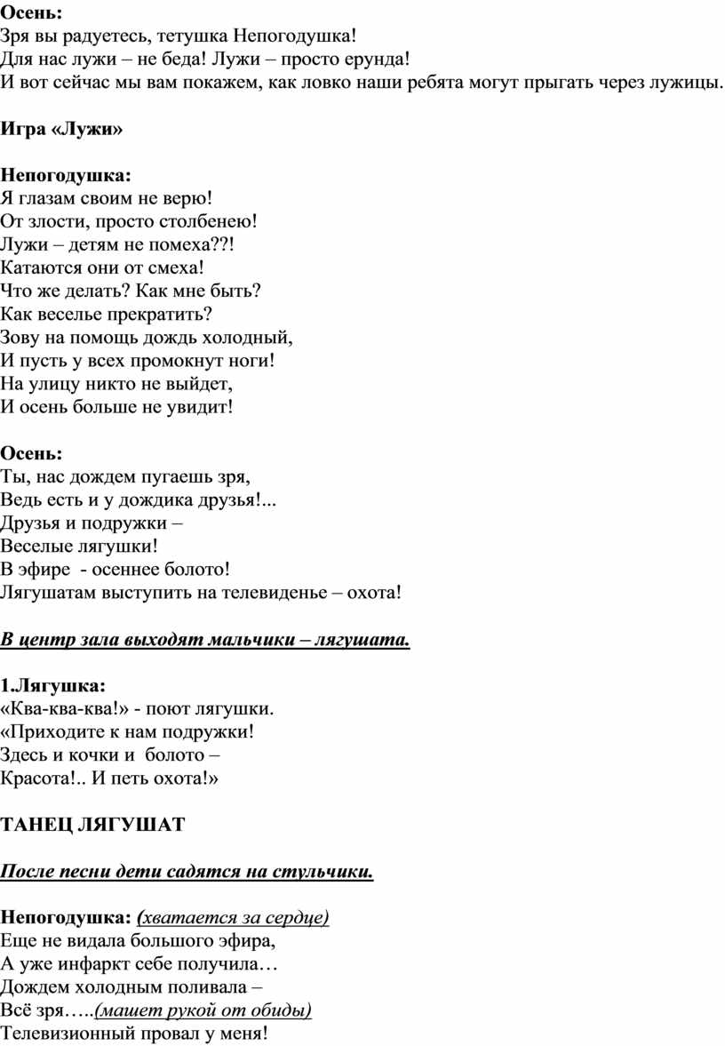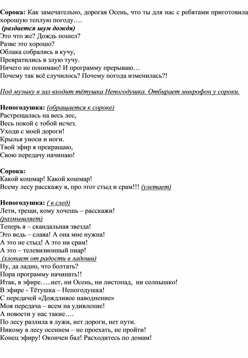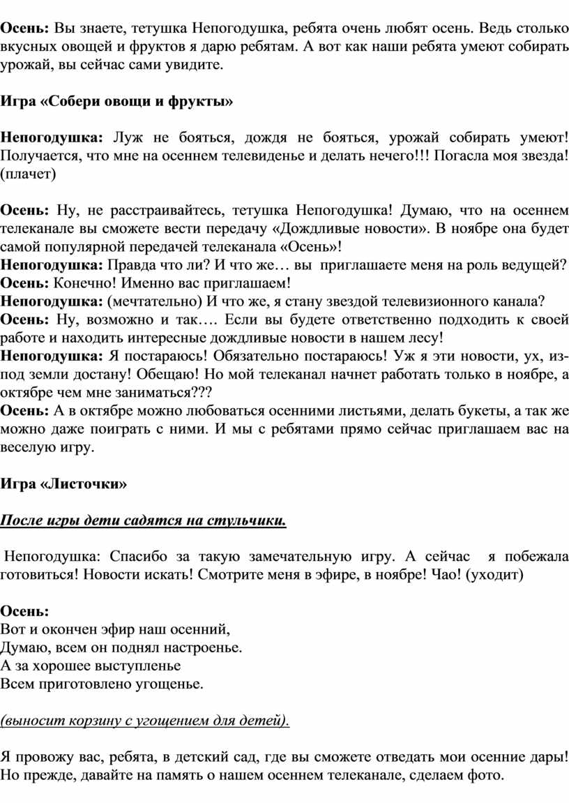 Осень: Ну, не расстраивайтесь, тетушка Непогодушка! Думаю, что на осеннем телеканале вы сможете вести передачу «Дождливые новости». В ноябре она будет самой популярной передачей телеканала «Осень»!