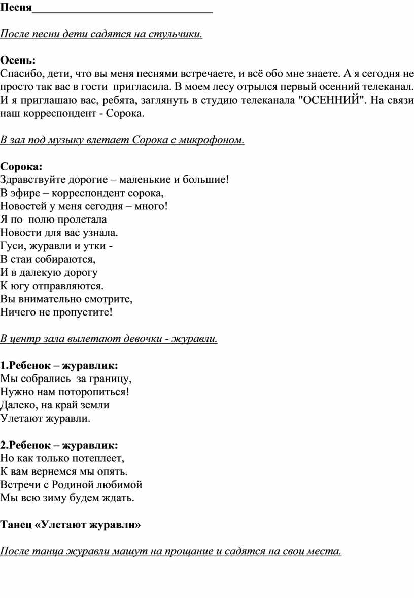 Спасибо, дети, что вы меня песнями встречаете, и всё обо мне знаете. А я сегодня не просто так вас в гости пригласила. В моем лесу отрылся первый осенний телеканал. И я приглашаю вас, ребята, заглянуть в студию телеканала "ОСЕННИЙ". На связи наш корреспондент - Сорока.