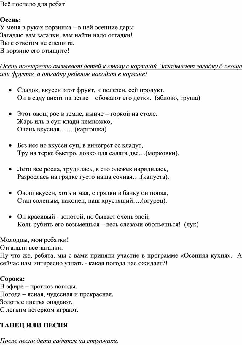 Мы с вами ребята посмотрели и прослушали передачу – «Золотой листопад», а сейчас в эфире программа «Осенняя кухня». Что нам расскажите об осенних овощах и фруктах, корреспондент сорока?