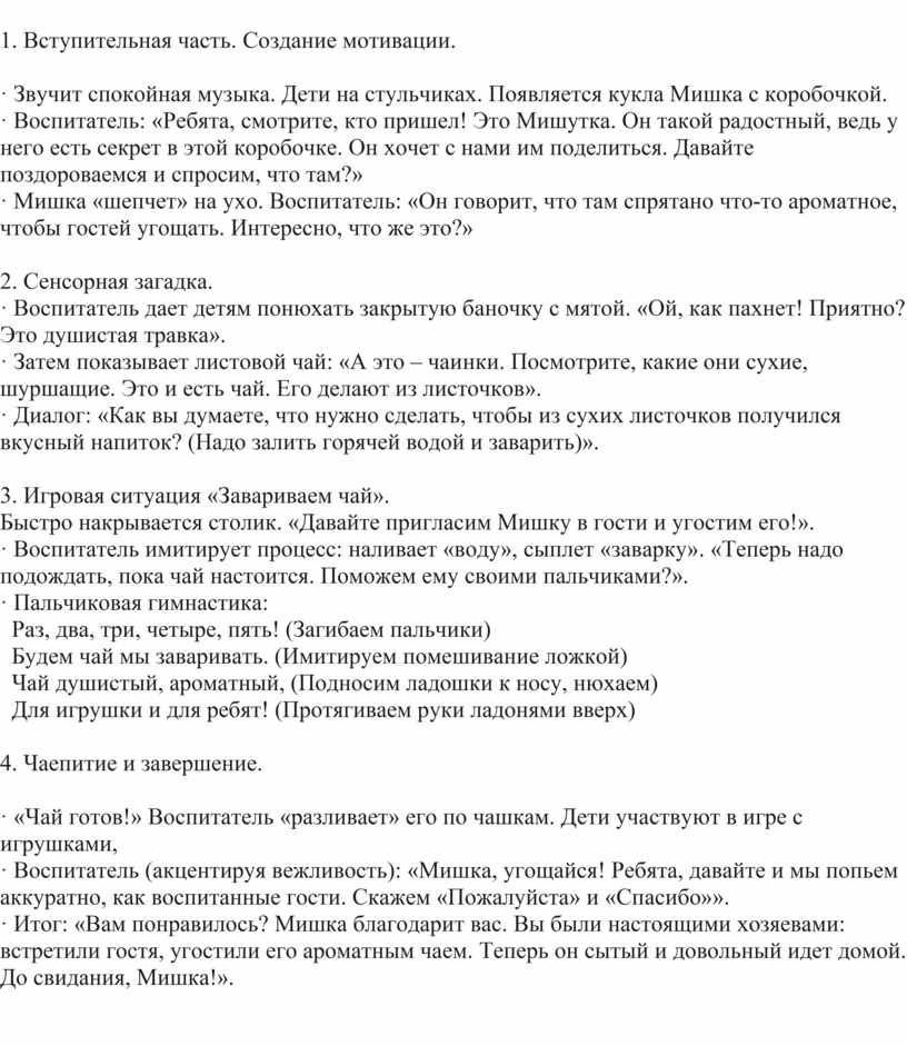 (узнавание аромата мяты), осязание (исследование сухих чаинок), зрение