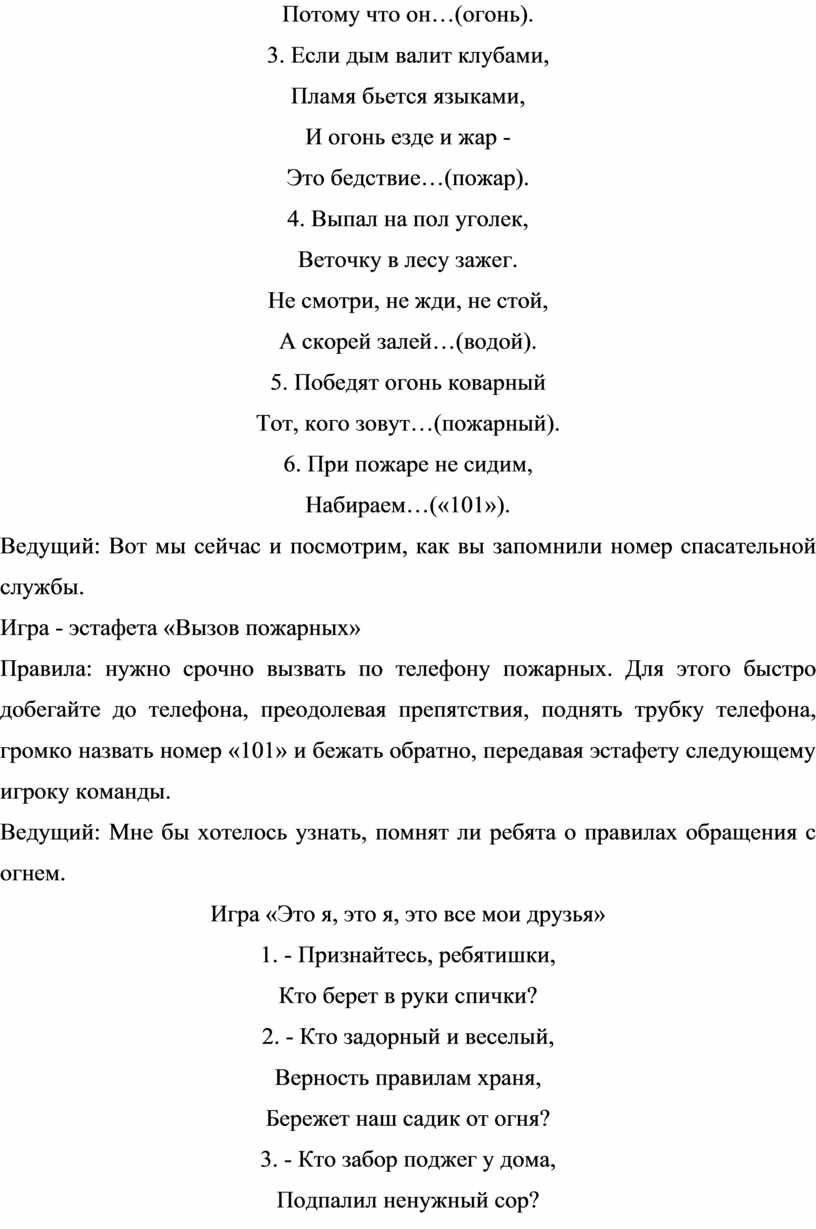 Ведущий: Мне бы хотелось узнать, помнят ли ребята о правилах обращения с огнем.