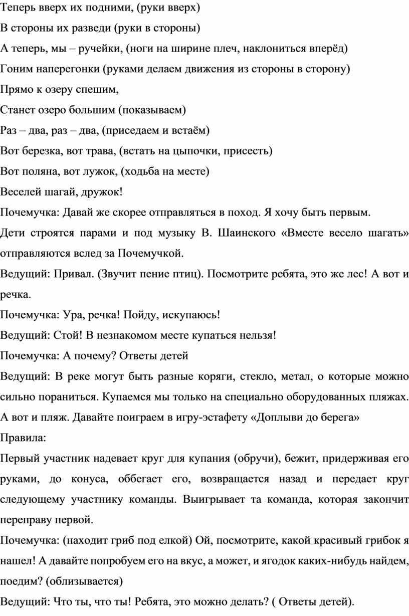 Ведущий: Ребята, а вы знаете главное правило в походе? В походе нужно идти дружно за направляющим, не отставать и никуда не отвлекаться. А еще нельзя трогать насекомых и животных, есть незнакомые ягоды и грибы.