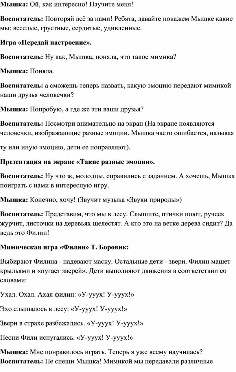 Воспитатель: Да Мышка, мимикой мы передаем свои эмоции - чувства и настроения.