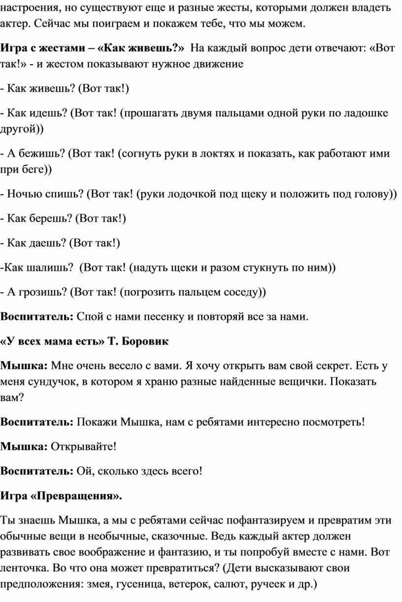 Мышка: Мне понравилось играть. Теперь я уже всему научилась? Воспитатель: Не спеши Мышка! Мимикой мы передавали различные настроения, но существуют еще и разные жесты, которыми должен владеть актер. Сейчас мы поиграем и покажем тебе, что мы можем.