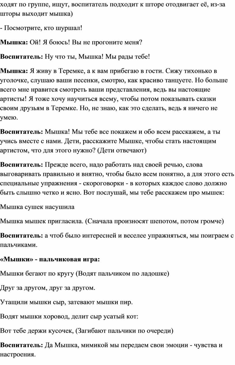 Мышка: Я живу в Теремке, а к вам прибегаю в гости. Сижу тихонько в уголочке, слушаю ваши песенки, смотрю, как красиво танцуете. Но больше всего мне нравится смотреть ваши представления, ведь вы настоящие артисты! Я тоже хочу научиться всему, чтобы потом показывать сказки своим друзьям в Теремке. Но, не знаю, как это сделать, ведь я ничего не умею.