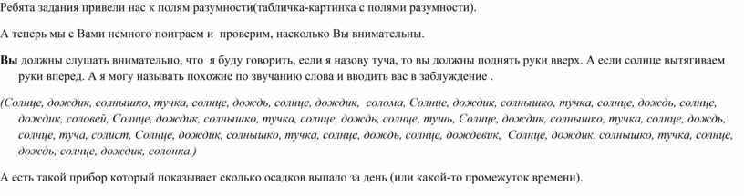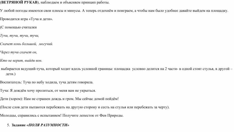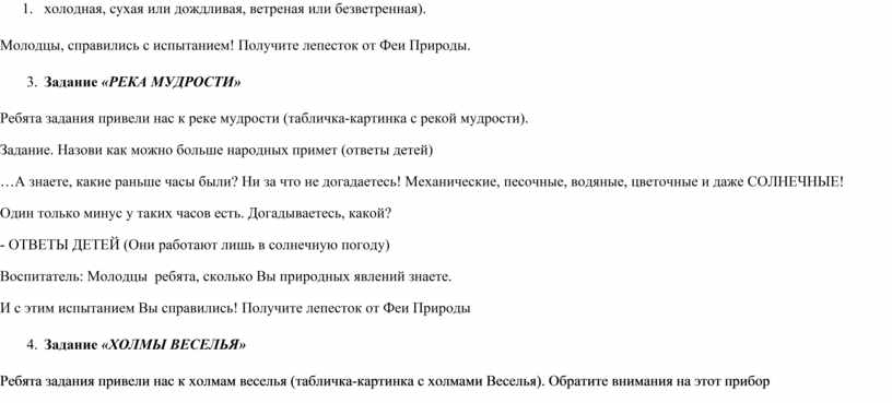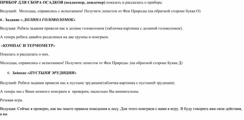 Молодцы, справились с испытанием! Получите лепесток от Феи Природы. 3. Задание «РЕКА МУДРОСТИ» Ребята задания привели нас к реке мудрости (табличка-картинка с рекой мудрости). Задание. Назови как можно больше народных примет (ответы детей) …А знаете, какие раньше часы были? Ни за что не догадаетесь! Механические, песочные, водяные, цветочные и даже СОЛНЕЧНЫЕ! Один только минус у таких часов есть. Догадываетесь, какой? - ОТВЕТЫ ДЕТЕЙ (Они работают лишь в солнечную погоду) Воспитатель: Молодцы ребята, сколько Вы природных явлений знаете. И с этим испытанием Вы справились! Получите лепесток от Феи Природы 4. Задание «ХОЛМЫ ВЕСЕЛЬЯ» Ребята задания привели нас к холмам веселья (табличка-картинка с холмами Веселья). Обратите внимания на этот прибор (ВЕТРЯНОЙ РУКАВ), наблюдаем и объясняем принцип работы. У любой погоды имеются свои плюсы и минусы. А теперь отдохнём и поиграем, а чтобы нам было удобнее давайте выйдем на площадку. Проводится игра «Туча и дети». (С помощью считалки Тучи, тучи, тучи, тучи, Скачет конь большой, могучий. Через тучи скачет он, Кто не верит, выйди вон. выбирается ведущий-туча, который ходит вдоль условной границы: площадка условно делится на 2 части- в одной стоят стулья, в другой – дети.) Воспитатель: Туча по небу ходила, туча детям говорила. Туча: Я дождём хочу пролиться, от меня вам не укрыться. Дети (хором): Нам не страшен дождь и гром. Мы сейчас домой пойдём! (После слов дети пытаются перебежать на другую сторону и сесть на стулья или перебежать за черту). Молодцы, справились с испытанием! Получите лепесток от Феи Природы. 5. Задание «ПОЛЯ РАЗУМНОСТИ» Ребята задания привели нас к полям разумности(табличка-картинка с полями разумности). А теперь мы с Вами немного поиграем и проверим, насколько Вы внимательны. Вы должны слушать внимательно, что я буду говорить, если я назову туча, то вы должны поднять руки вверх. А если солнце вытягиваем руки вперед. А я могу называть похожие по звучанию слова и вводить вас в заблуждение . (Солнце, дождик, солнышко, тучка, солнце, дождь, солнце, дождик, солома, Солнце, дождик, солнышко, тучка, солнце, дождь, солнце, дождик, соловей, Солнце, дождик, солнышко, тучка, солнце, дождь, солнце, тушь, Солнце, дождик, солнышко, тучка, солнце, дождь, солнце, туча, солист, Солнце, дождик, солнышко, тучка, солнце, дождь, солнце, дождевик, Солнце, дождик, солнышко, тучка, солнце, дождь, солнце, дождик, солонка.) А есть такой прибор который показывает сколько осадков выпало за день (или какой-то промежуток времени). ПРИБОР ДЛЯ СБОРА ОСАДКОВ (осадкомер, дождемер) показать и рассказать о приборе. Ведущий: Молодцы, справились с испытанием! Получите лепесток от Феи Природы (на обратной стороне буква О) 6 . Задание « ДОЛИНА ГОЛОВОЛОМОК» Ведущая: Ребята задания привели нас к долине головоломок (табличка-картинка с долиной головоломок). А теперь ребята давайте разделимся на две группы и поиграем. «КОМПАС И ТЕРМОМЕТР» Показать и рассказать о них. Молодцы, справились с испытанием! Получите лепесток от Феи Природы. (на обратной стороне Буква Д) 6. Задание «ПУСТЫНЯ ЭРУДИЦИИ» Ведущий: Ребята задания привели нас к пустыне эрудиции(табличка-картинка с пустыней эрудиции). А теперь мы с Вами немного поиграем и проверим, насколько Вы внимательны. Речевая игра. Ведущая: Сейчас я проверю, как вы знаете правила поведения в лесу. Для этого поиграем с вами 